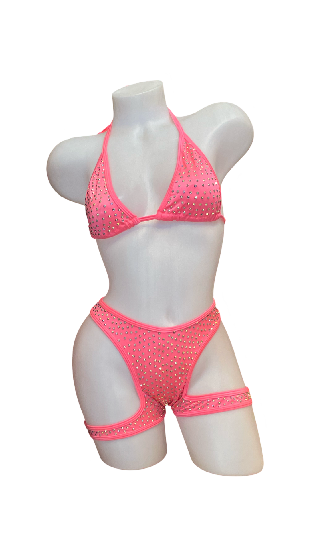 Rhinestone Triangle Top Booty Garter Shorts Coral