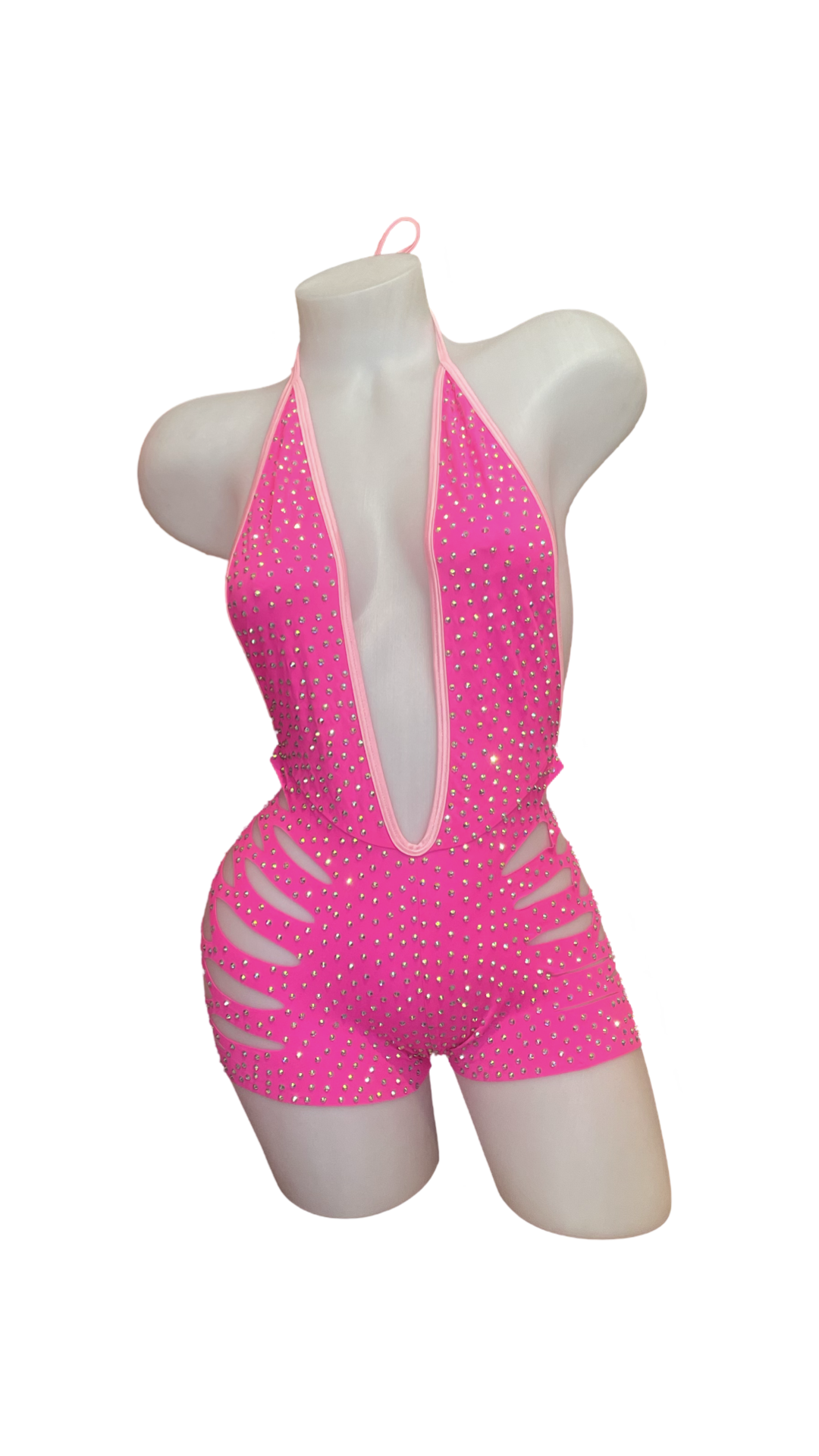 Rhinestone One Piece Short Set - Pink/Baby Pink